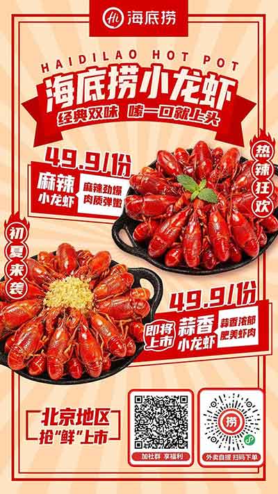 像是海底撈在5月10日,北京的門店開賣49.9元一份的小龍蝦,推出兩種口味,一種是麻辣、一種是黃金蒜香。顧客可以在線上小程序上自己下單,門店自提或者外賣都可以。